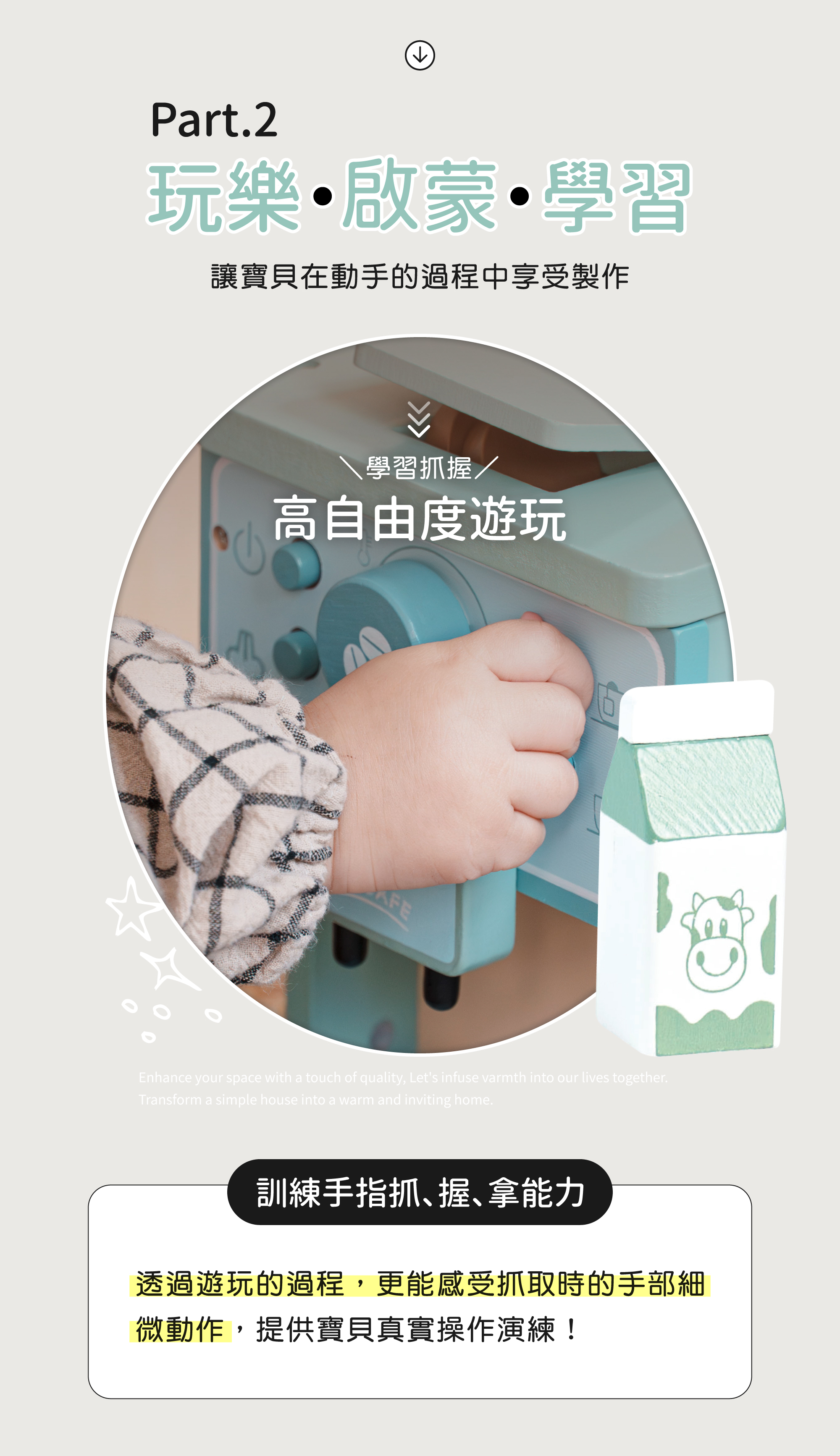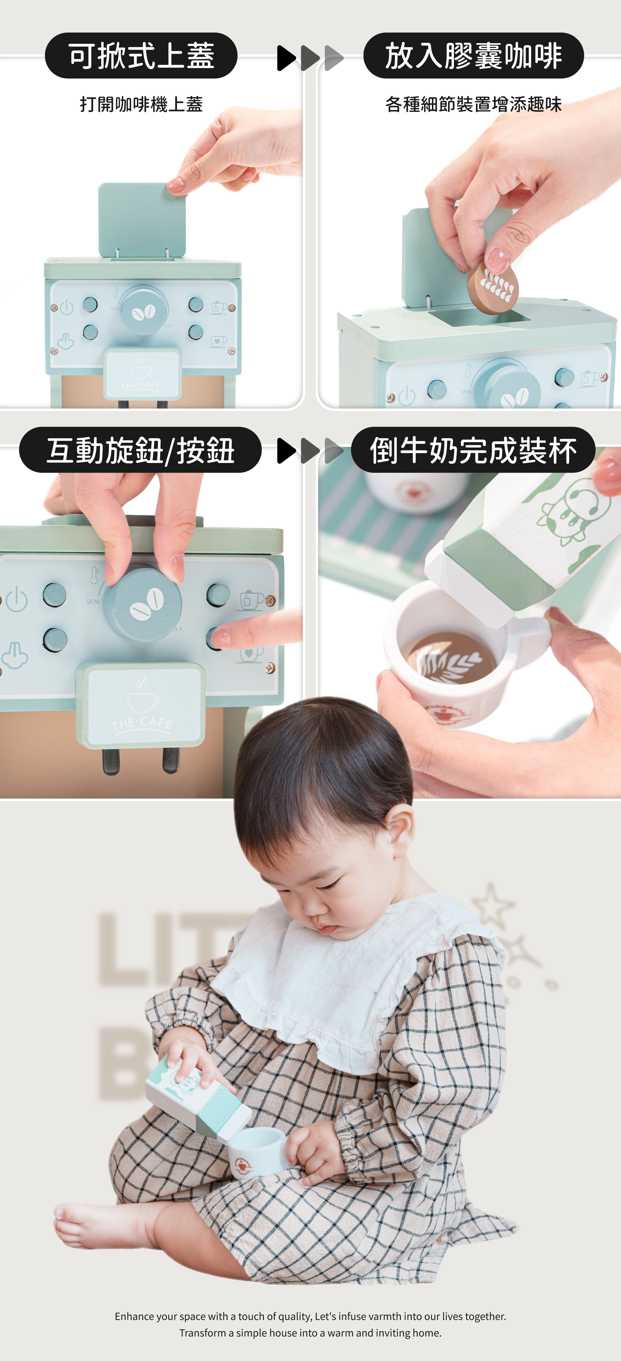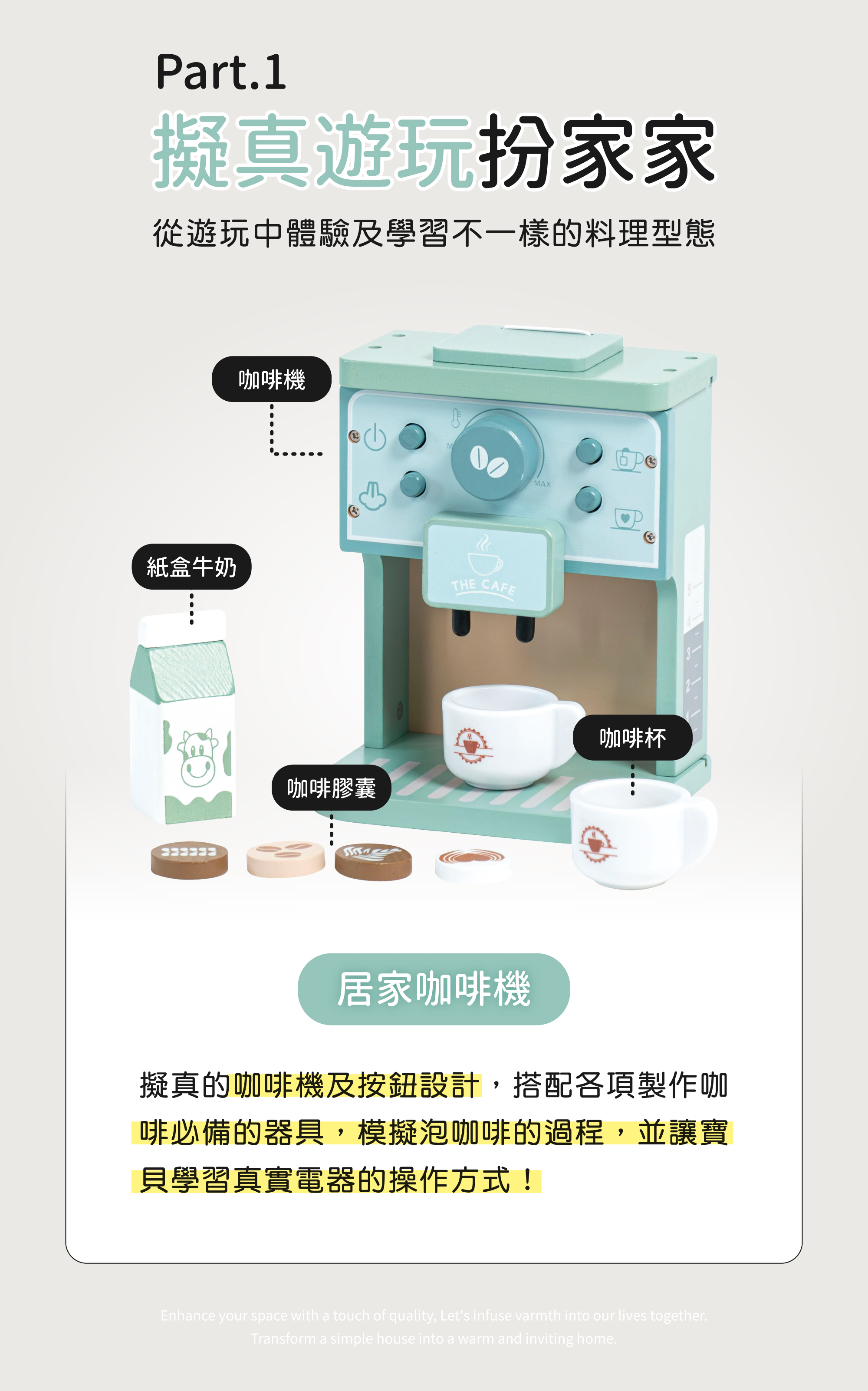 ★擬真的咖啡機及按鈕設計,搭配各項製作咖啡必備的器具,模擬泡咖啡的過程,並讓寶貝學習真實電器的操作方式