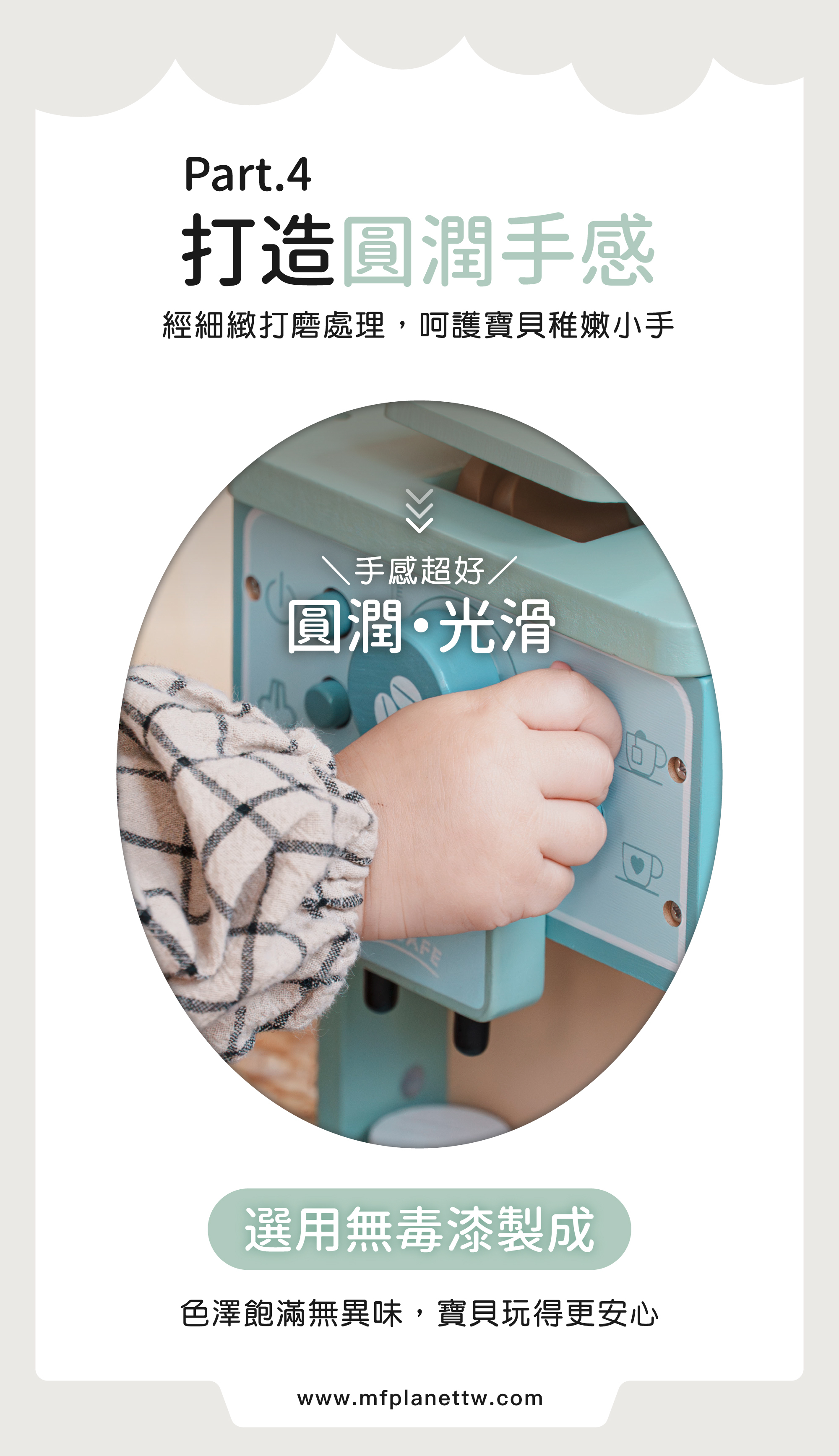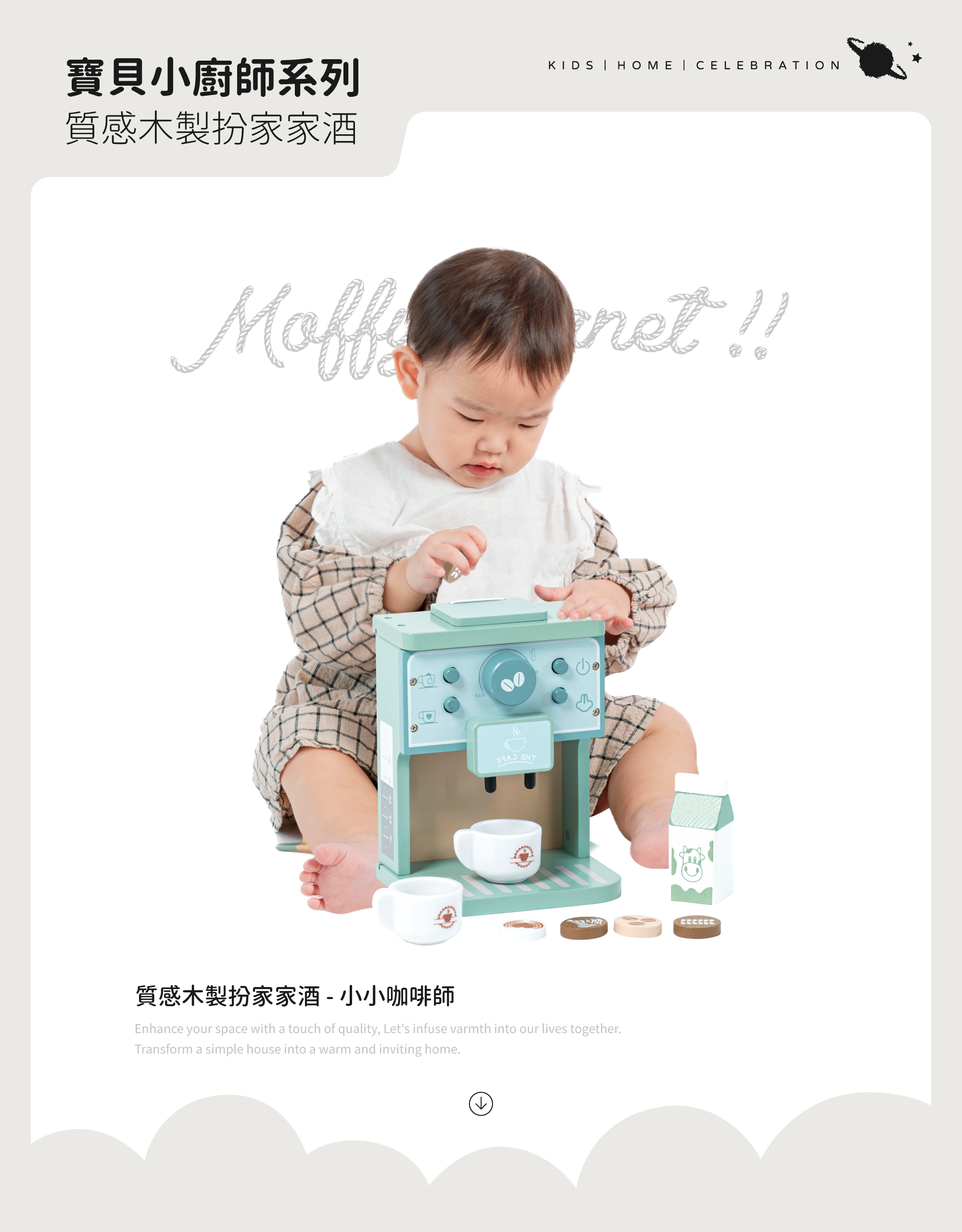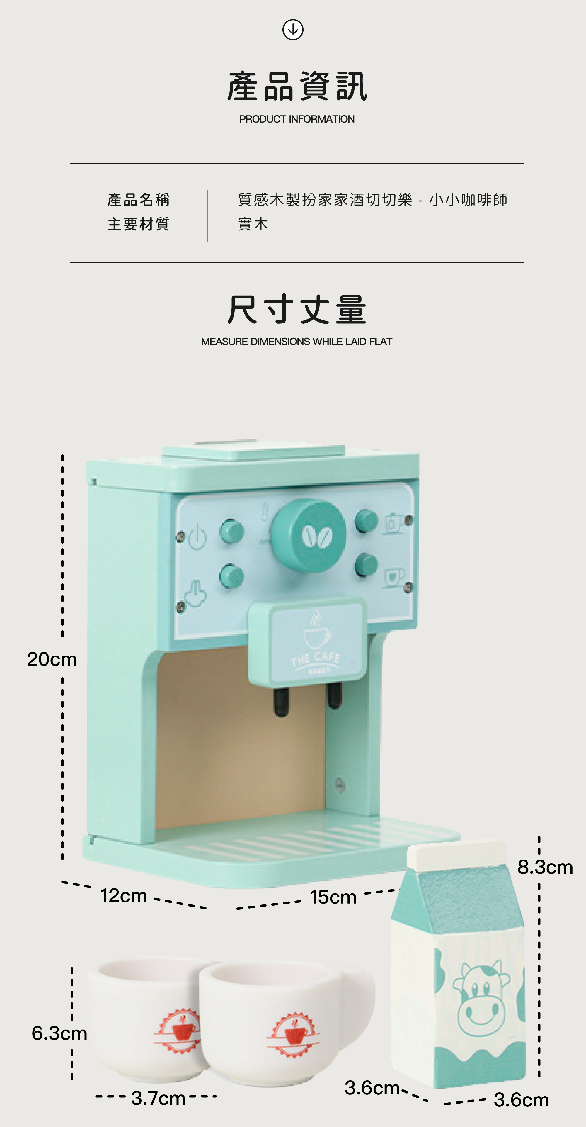 ★擬真的咖啡機及按鈕設計,搭配各項製作咖啡必備的器具,模擬泡咖啡的過程,並讓寶貝學習真實電器的操作方式