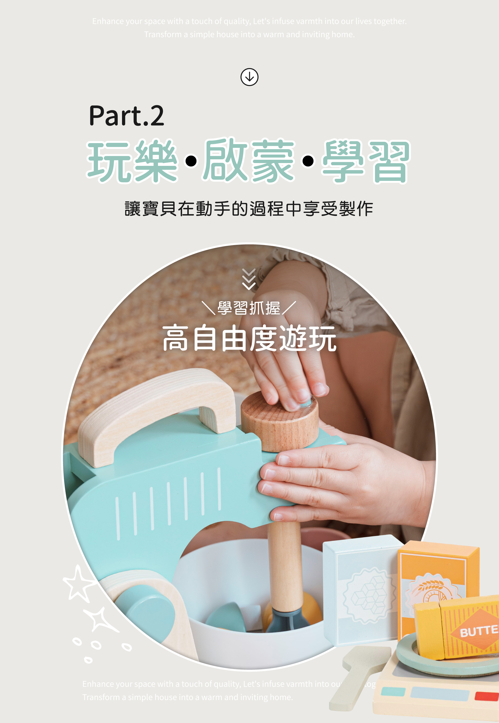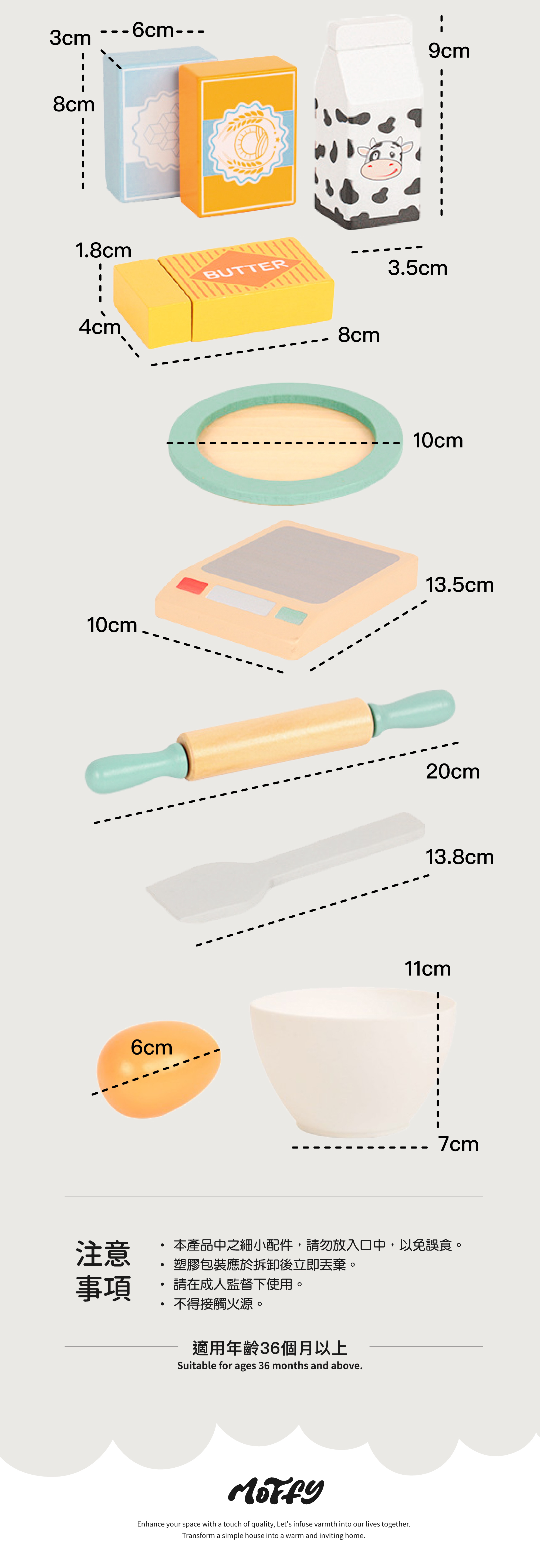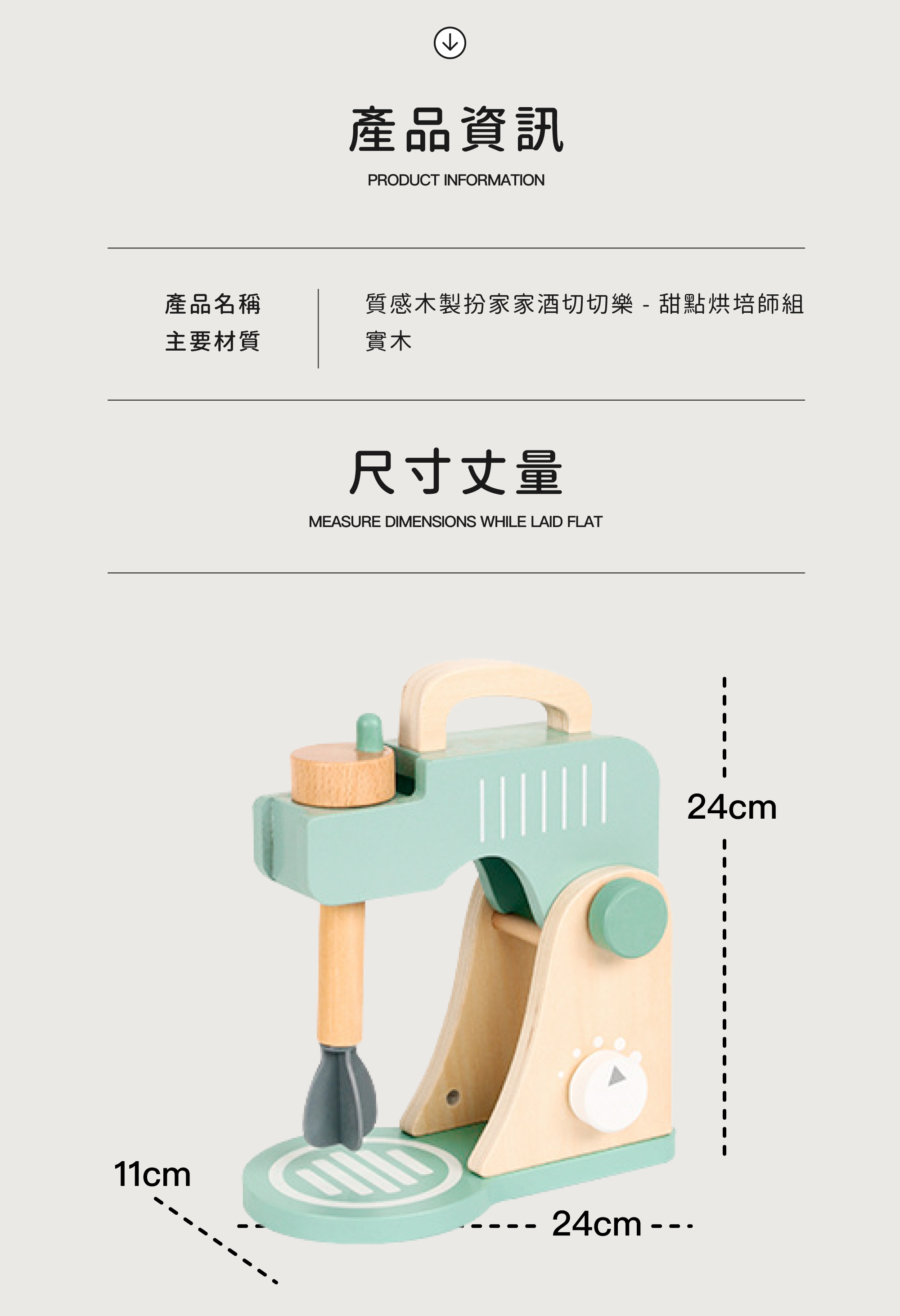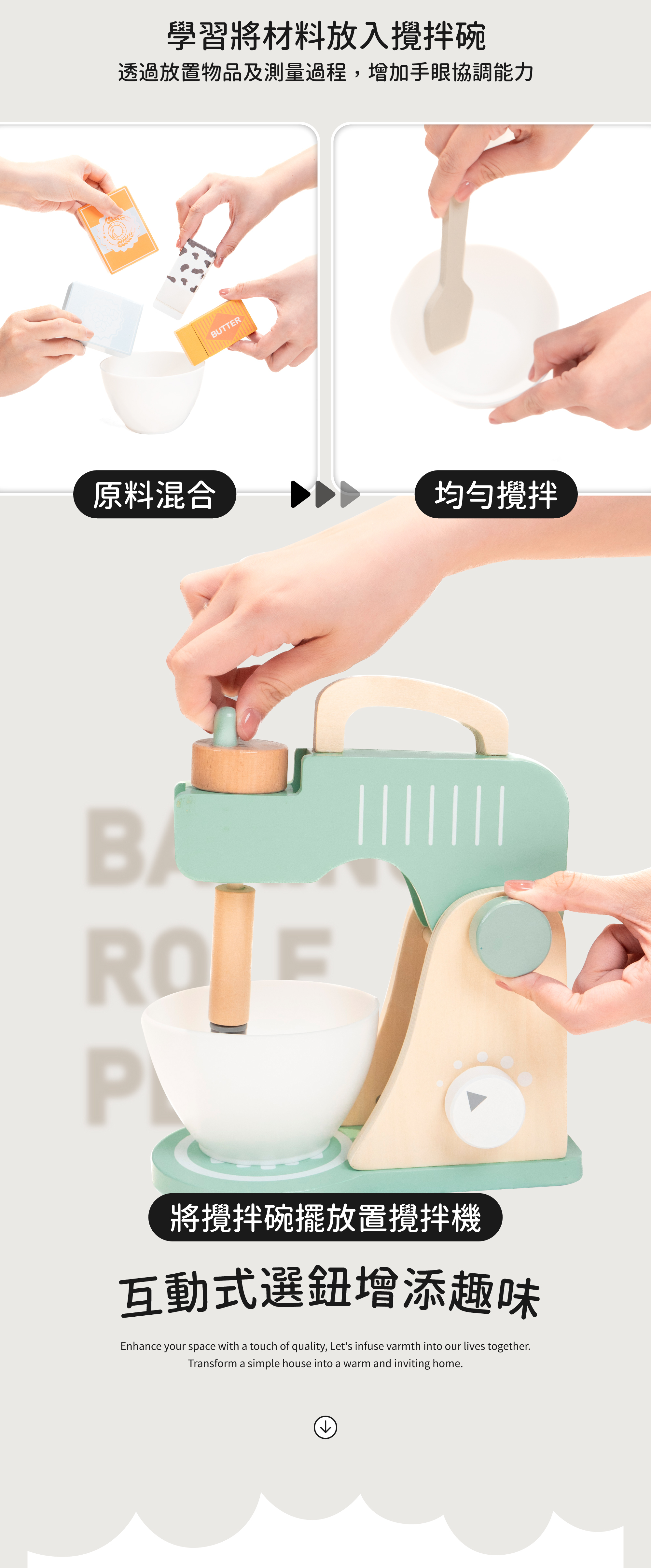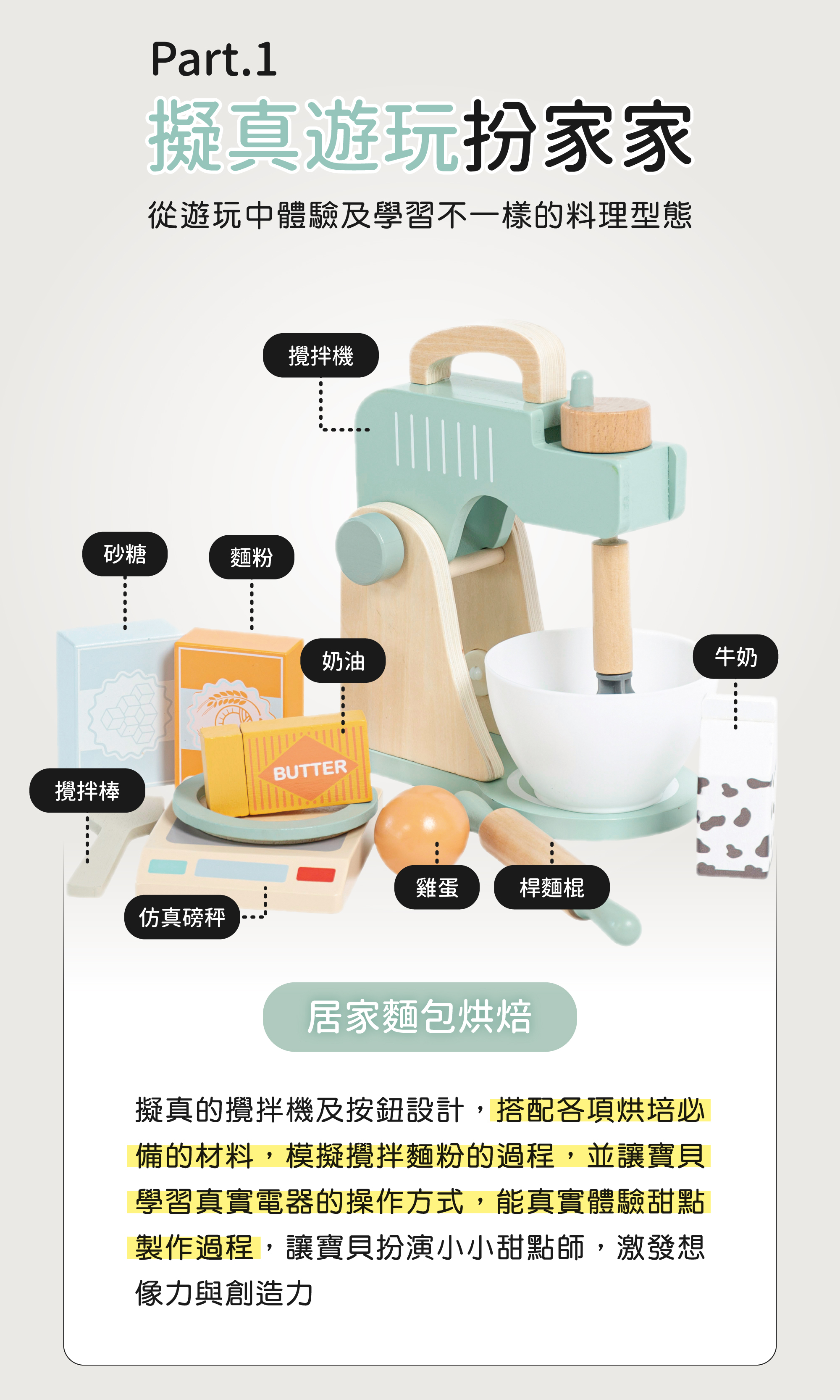 ★擬真的攪拌機及按鈕設計,搭配各項烘培必備的材料,模擬攪拌麵粉的過程,並讓寶貝學習真實電器的操作方式