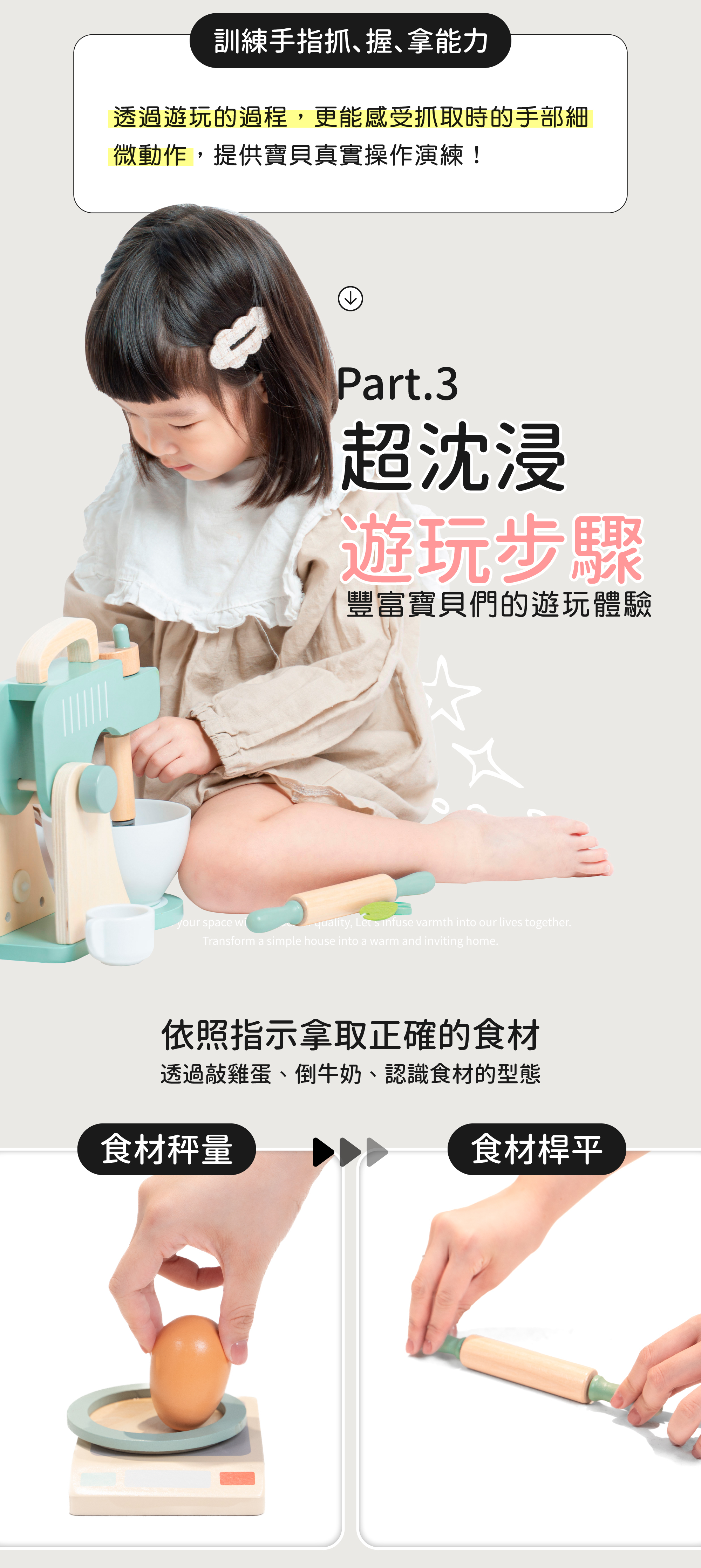 ★依照指示拿取正確的食材,透過敲雞蛋,倒牛奶,認識食材的型態