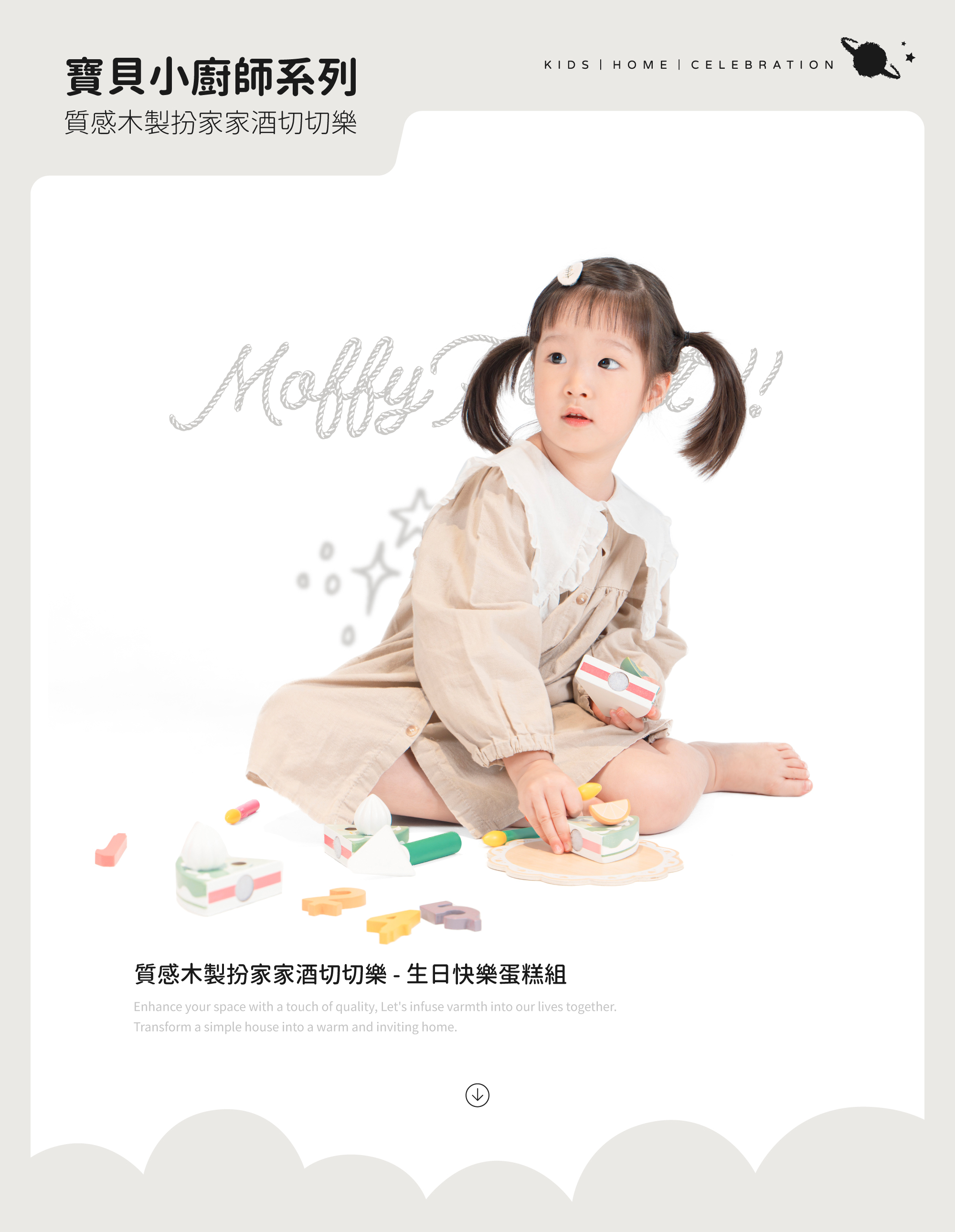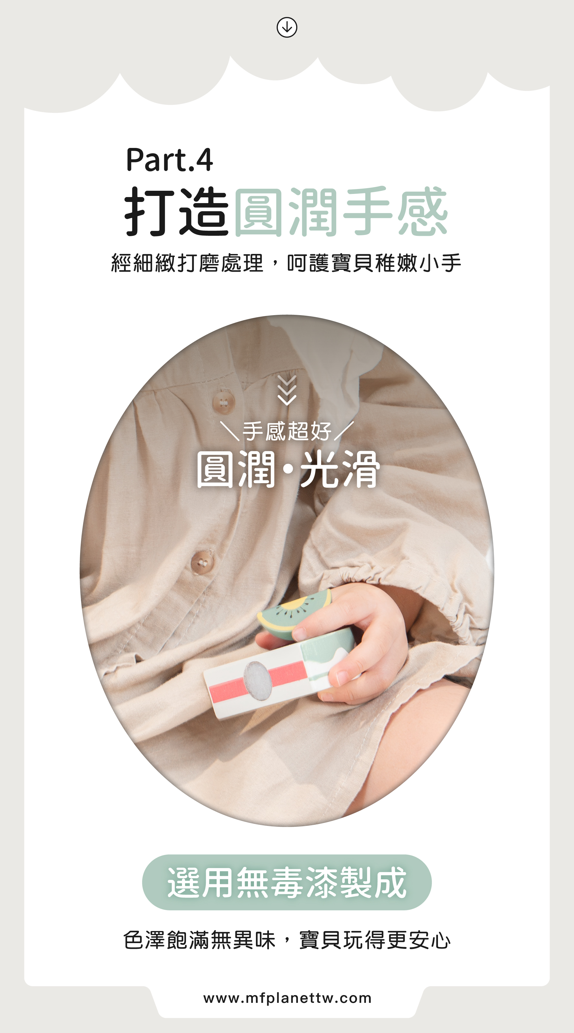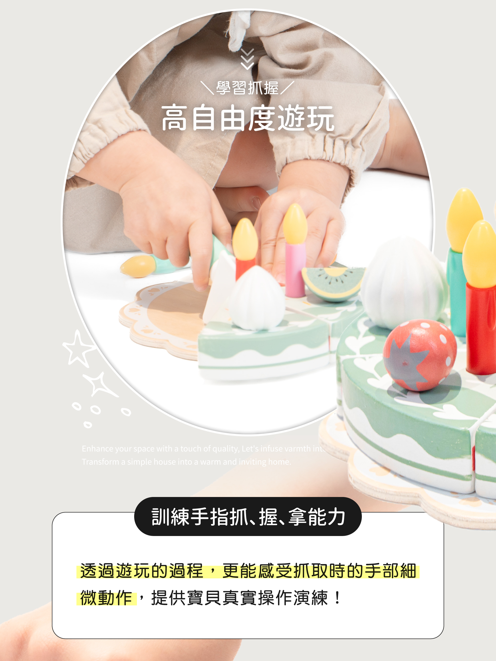 ★玩具蛋糕運用嵌入式的魔鬼氈設計,以便於寶貝切開,木刀設計促進手指靈活及小肌肉運動的發展,強化抓握能力及細部動作