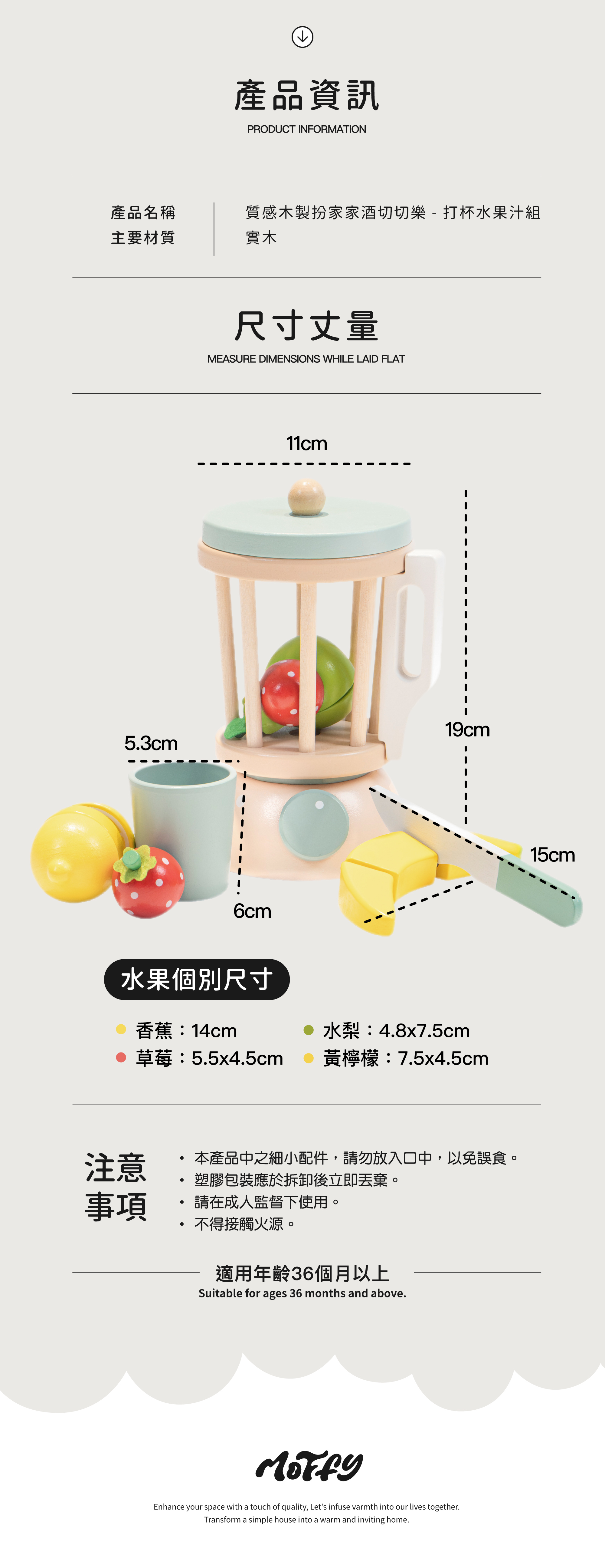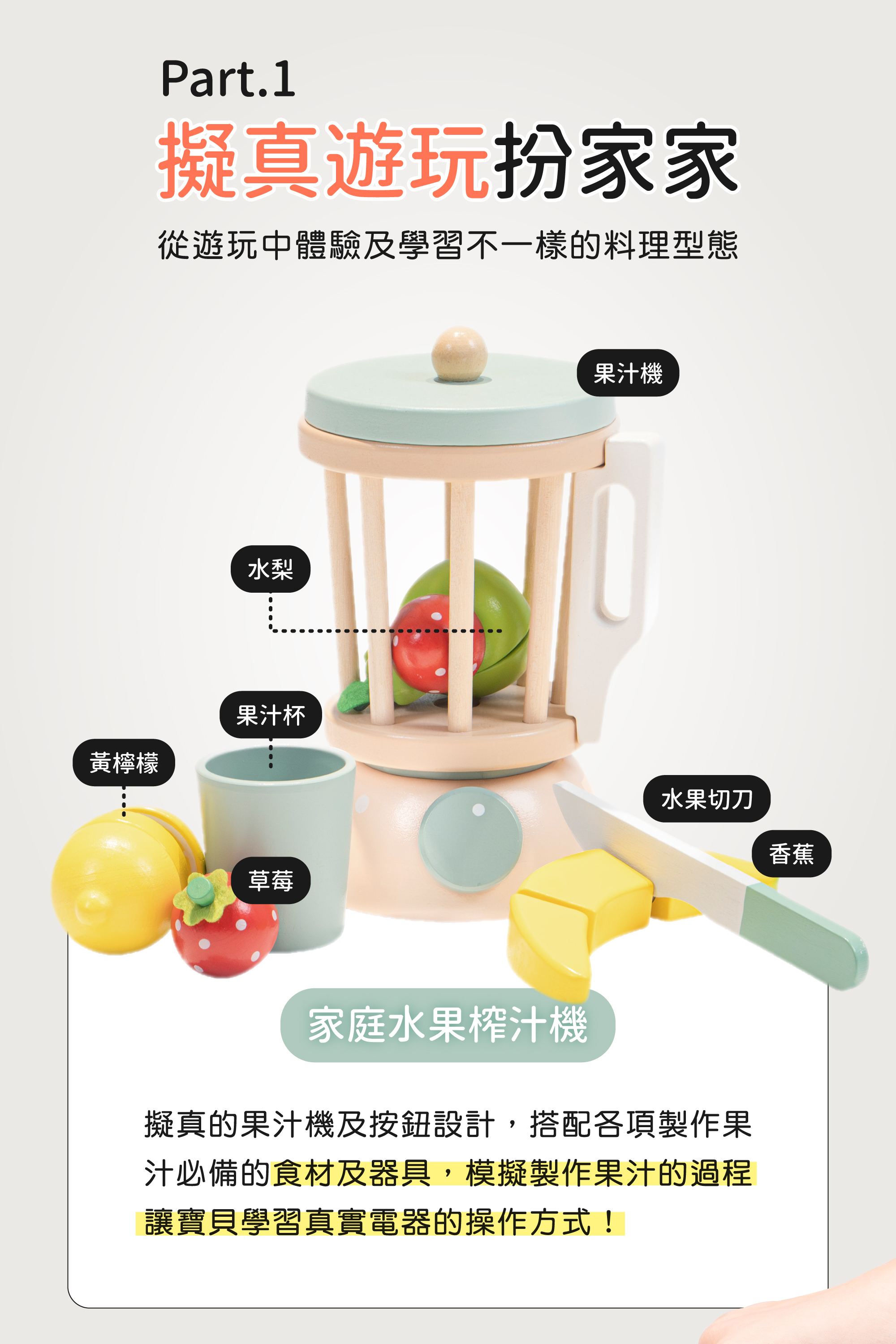 ★擬真的果汁機及按鈕設計,搭配各項製作果汁必備的食材及器具,模擬製作果汁的過程,並讓寶貝學習真實電器的操作方式
