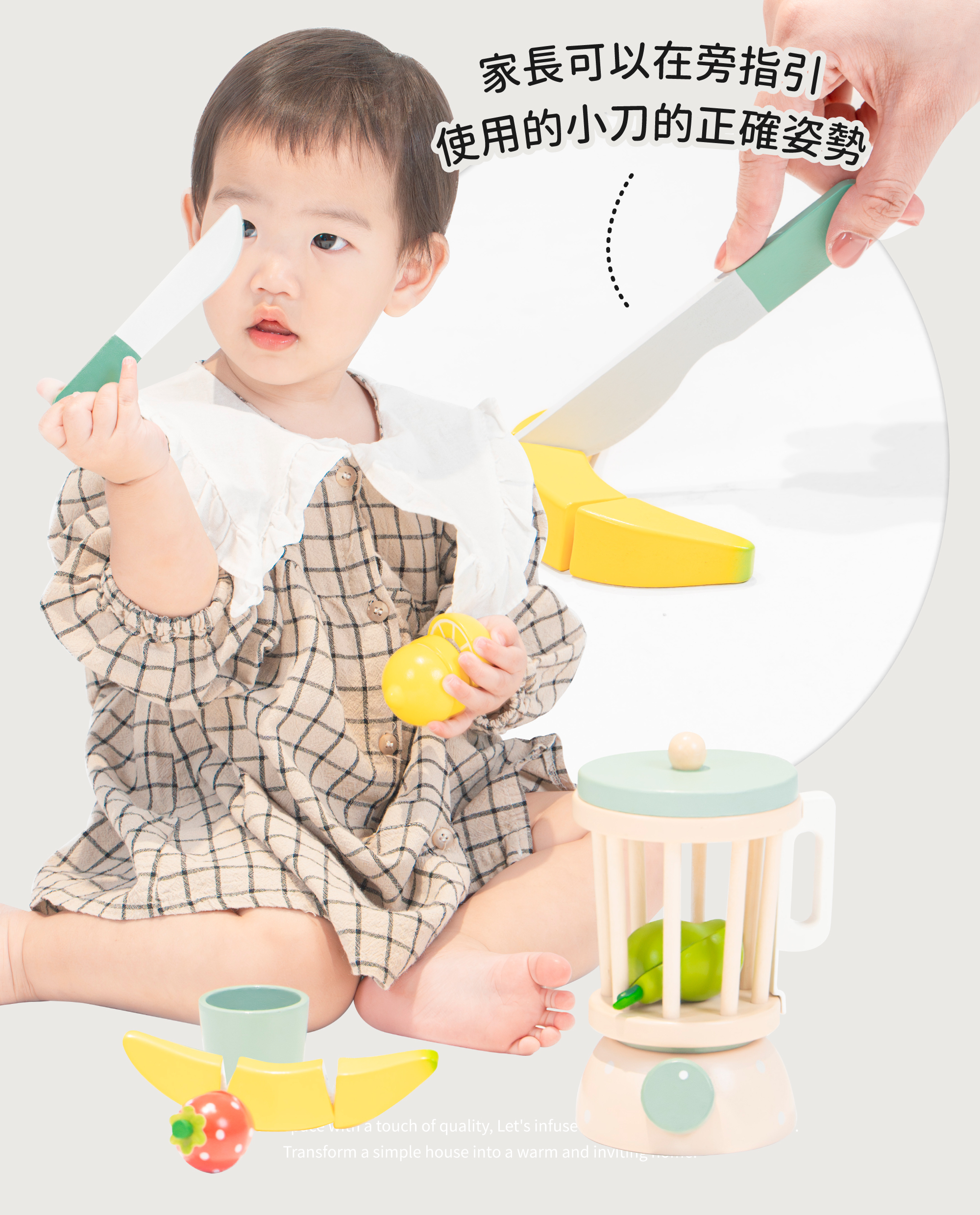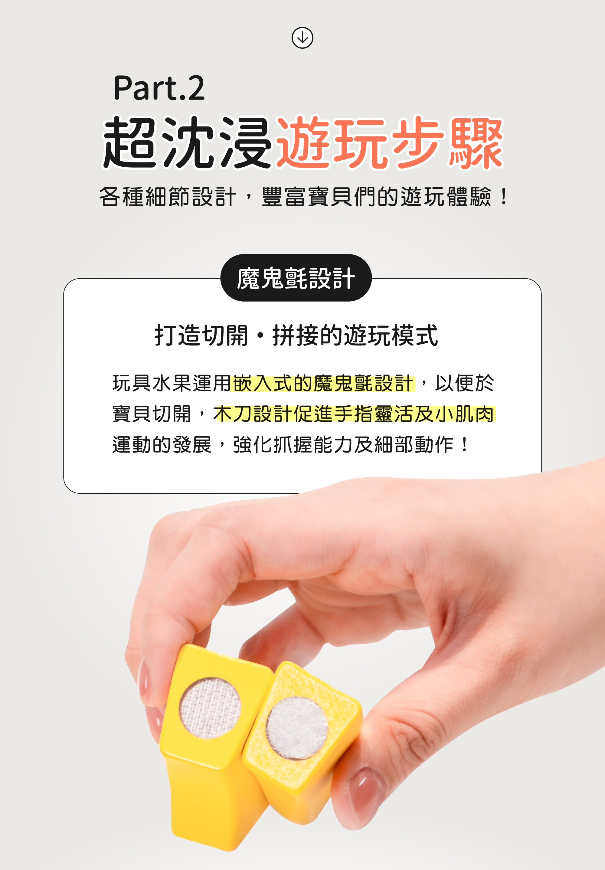 ★玩具水果運用嵌入式的魔鬼氈設計,以便於寶貝切開,木刀設計促進手指靈活及小肌肉運動的發展,強化抓握能力及細部動作