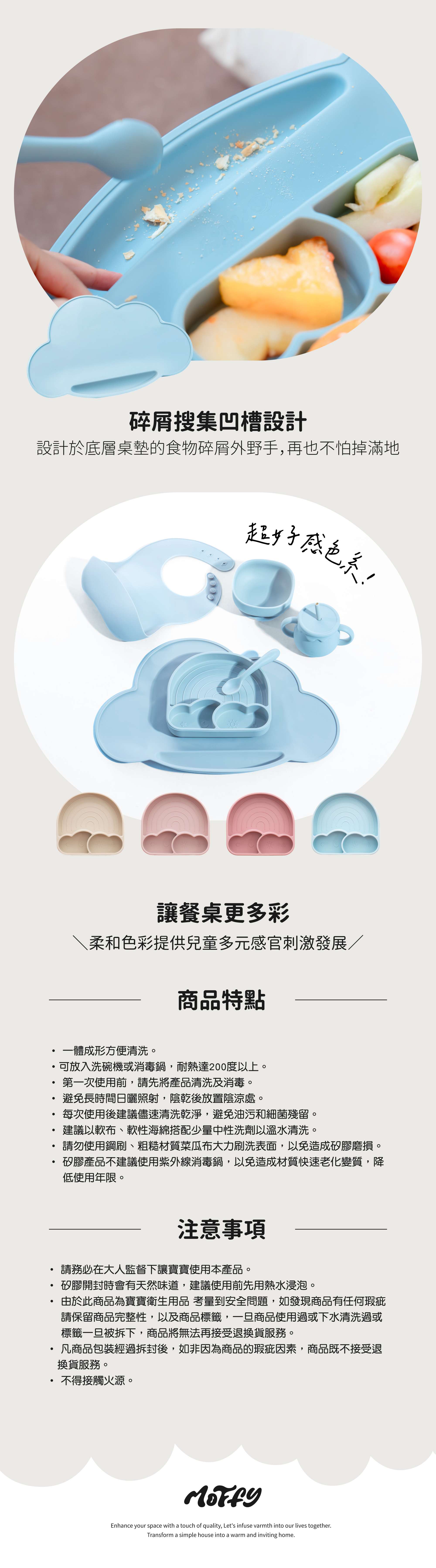 ★ 雲朵餐墊立體弧邊設計,可蒐集掉落食物,保持桌面乾淨整潔