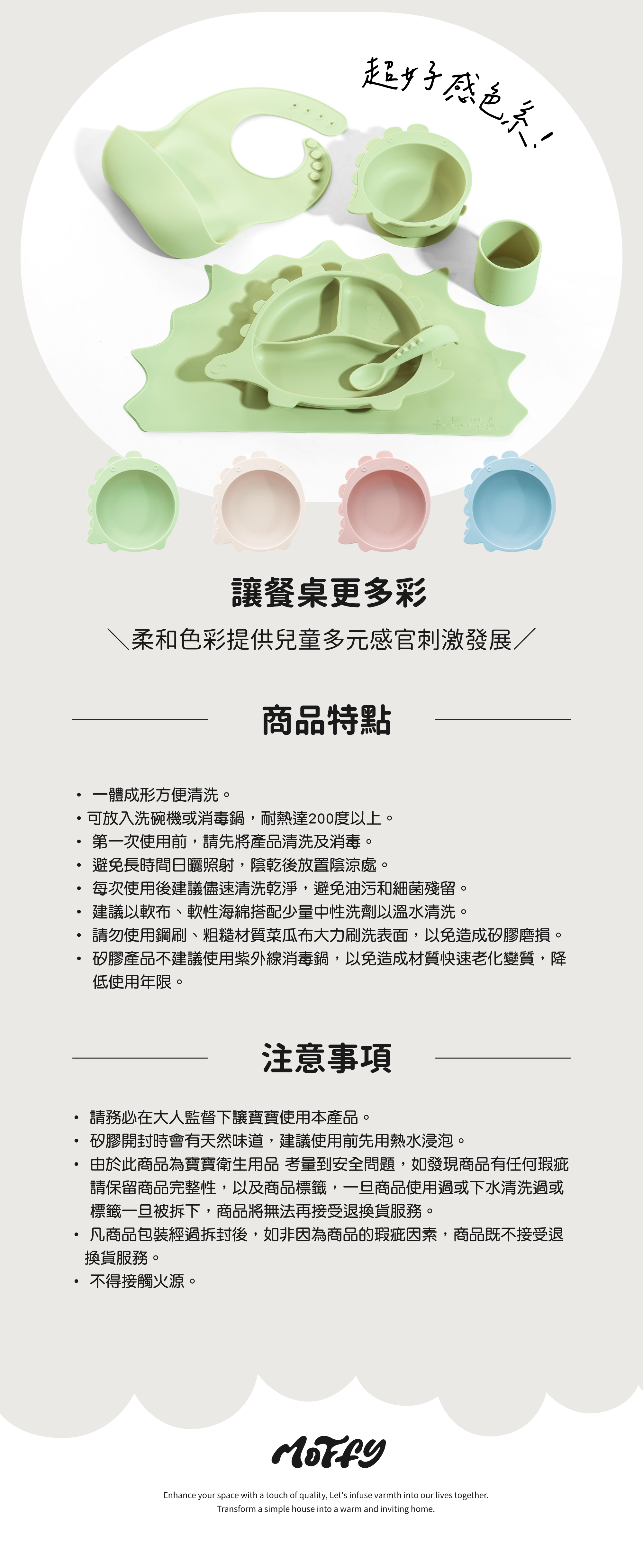 ★ 六件組設計:恐龍造型餐盤、恐龍造型吸盤餐碗、恐龍造型矽膠湯匙、飲用杯、恐龍造型餐墊、質感圍兜,一次滿足